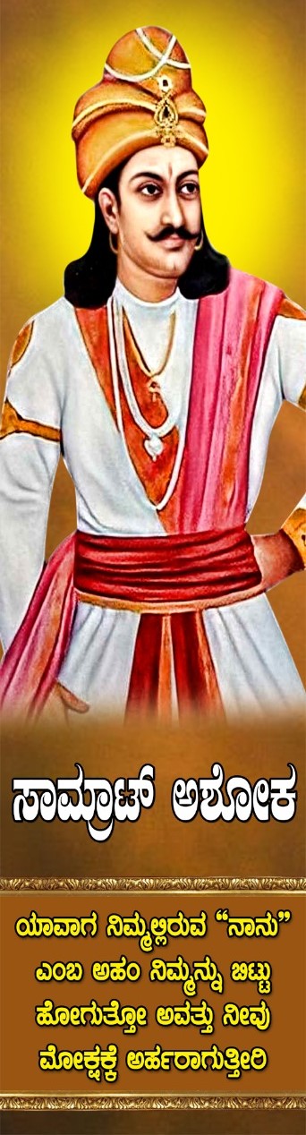 ಇತಿಹಾಸದ ಶ್ರೇಷ್ಠ ರಾಜರಲ್ಲಿ ಒಬ್ಬರು. ತಂದೆ ಬಿಂದುಸಾರ, ತಾಯಿ ಸುಭದ್ರಾಂಗಿ. 101 ಗಂಡು ಮಕ್ಕಳಲ್ಲಿ ಅಶೋಕ ಎರಡನೇ ಮಗ. ಬಾಲ್ಯದಲ್ಲಿಯೇ ಅತ್ಯಂತ ಚಾಣಾಕ್ಷ ಮತ್ತು ಶೂರನಾಗಿದ್ದ ಅಶೋಕನು ತನ್ನ ಅದಿನಾರನೇ ವಯಸ್ಸಿನಲ್ಲೇ ಯುದ್ಧಮಾಡಿ ಗೆದ್ದವನು. 273 BC ಯಲ್ಲಿ ಪಟ್ಟಾಧಿಕಾರ ಹೊಂದಿದನು. ಶಿವ ಭಕ್ತಿಯೊಂದಿಗೆ ಎಲ್ಲಾ ಮತ ಪಂಥಗಳ ಬಗ್ಗೆ ಗೌರವ ಹೊಂದಿದ್ದನು. ಕಳಿಂಗ ಯುದ್ಧದ ನಂತರ, ಅಪಾರ ಸಾವು ನೋವುಗಳಿಗೆ, ಬಂಧನಗಳಿಂದ ನೊಂದು ಬೌದ್ಧ ಧರ್ಮವನ್ನು ಸ್ವೀಕರಿಸಿದನು. ಬೌದ್ಧ ಧರ್ಮದ ಪ್ರಚಾರಕ್ಕಾಗಿ ಹಲವಾರು ಮಿಷಿನರಿಗಳನ್ನು ಸ್ಥಾಪಿಸಿದನು. ಜನರ ನೆರಳಿಗಾಗಿ ಆಲದ, ಮಾವಿನ ತೋಪುಗಳನ್ನು ನೆಡಿಸಿದನು. ರಸ್ತೆ ಬದಿಯಲ್ಲಿ ಬಾವಿಗಳನ್ನು ಮತ್ತು ಜನರಿಗೆ ವಿಶ್ರಾಂತಿ ಗೃಹಗಳನ್ನು ನಿರ್ಮಿಸಲು ಆದೇಶಿಸಿದನು. ಪ್ರಾಣಿಗಳಿಗೆ ನೀರುಣಿಸುವ ಸ್ಥಳಗಳನ್ನು, ಜನರ ಮತ್ತು ಪ್ರಾಣಿಗಳ ಚಿಕಿತ್ಸಾ ಕೇಂದ್ರಗಳ ವ್ಯವಸ್ಥೆ ಮಾಡಿದನು. ಅವರು ಜನರ ಚಿಕಿತ್ಸೆಗಾಗಿ ಔಷಧೀಯ ಗಿಡಮೂಲಿಕೆಗಳನ್ನು ನೆಟ್ಟರು. ಪ್ರಾಣಿಬಲಿ ನಿಲ್ಲಿಸಲು ಮತ್ತು ಪ್ರಾಣಿಗಳಿಗೆ ಗಾಯವನ್ನು ಪರಿಶೀಲಿಸಲು ಶಾಸನಗಳನ್ನಲ್ಲದೆ , ಮಾಂಸಕ್ಕಾಗಿ ಪ್ರಾಣಿಗಳನ್ನು ಕೊಲ್ಲುವ ಸಮಾಜಗಳನ್ನು ನಿಷೇಧಿಸಿದನು. ತನ್ನ ಜೀವನವನ್ನು ಸಂಪೂರ್ಣವಾಗಿ ಬೌದ್ಧ ಧರ್ಮದ ಪ್ರಚಾರಕ್ಕಾಗಿ ಮತ್ತು ಧಾರ್ಮಿಕ ಆಚರಣೆಗಳಿಗೆ ಸೀಮಿತಗೊಳಿಸಿದನು. ರಾಜತಾಂತ್ರಿಕತೆ ಮತ್ತು ಆಡಳಿತದ ವ್ಯವಸ್ಥೆ ಹಿಡಿತ ತಪ್ಪಿದ್ದನ್ನು ಋಷ್ಯಶೃಂಗ ಎಂಬುವನು ಬಳಸಿಕೊಂಡು ಅಶೋಕನ ಮೌರ್ಯ ಸಾಮ್ರಾಜ್ಯವು ನಾಶವಾಗಲು ಕಾರಣನಾದನು.