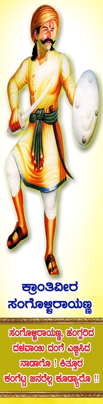 ಸಂಗೊಳ್ಳಿ ರಾಯಣ್ಣ 15 ಆಗಸ್ಟ್ 1798 ರಲ್ಲಿ ಜನಿಸಿ, 26 ಜನವರಿ 1831 ರಲ್ಲಿ ಹುತಾತ್ಮರಾದರು. ಬೆಳಗಾವಿಯ ಸಂಗೊಳ್ಳಿಯಲ್ಲಿ ಜನಿಸಿದ ಅವರು 19 ನೇ ಶತಮಾನದ ಆರಂಭದಲ್ಲಿ ಕಿತ್ತೂರು ಚೆನ್ನಮ್ಮ ರಾಜ್ಯವನ್ನು ಆಳುತ್ತಿದ್ದಾಗ ಕಿತ್ತೂರಿನ ರಾಜ ಸಂಸ್ಥಾನದ ಮಿಲಿಟರಿಯಲ್ಲಿ ಹಿರಿಯ ಕಮಾಂಡರ್ ಆಗಿ ಸೇವೆ ಸಲ್ಲಿಸಿದರು.